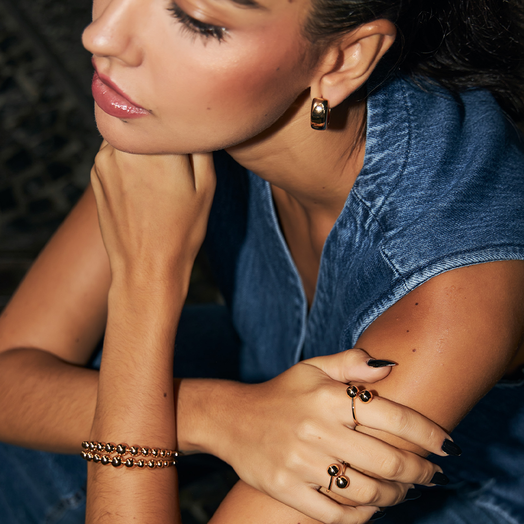 The Cleo ring is an adjustable open ring that comes in two options: 18k gold plated and rhodium plated. It is made up of two spheres that fit together perfectly. This ring is elegant and can be worn for any occasion.