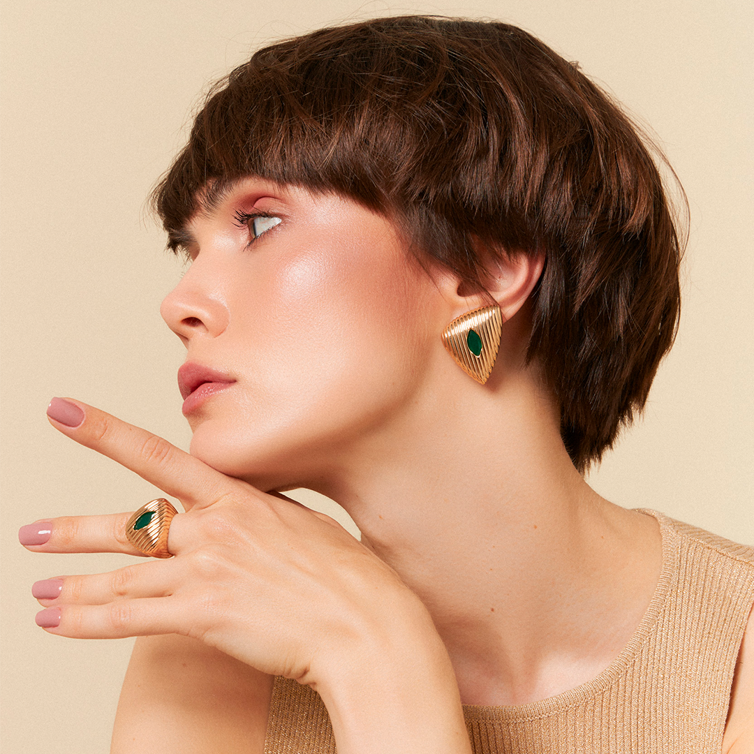 The Hemera earrings are a beautiful and bold addition to any jewellery collection. Plated in 18k gold, each stud features a dynamic, ridged surface and is set with a bright green crystal, giving them a modern and luxurious feel.